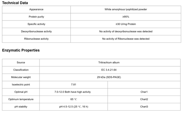 Proteinase K from the fungus Tritirachium album is a nonspecific serine protease that is useful for general digestion of proteins. Removal of endogenous nucleases during the preparation of DNA and RNA; preparation of tissue sections for in situ hybridization.